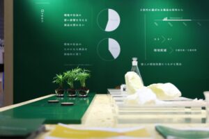 展示ブースはコーポレートカラーである緑を基調とし、廃棄物を最小限に抑えたシンプルなデザインです。
